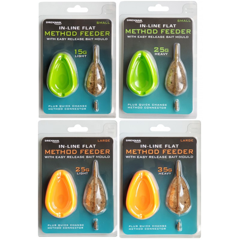 With this improved design of Drennan In-Line Flat Method Feeder, both the lead in the flat base and the bait load distribute the weight into an aerodynamic bomb shape.