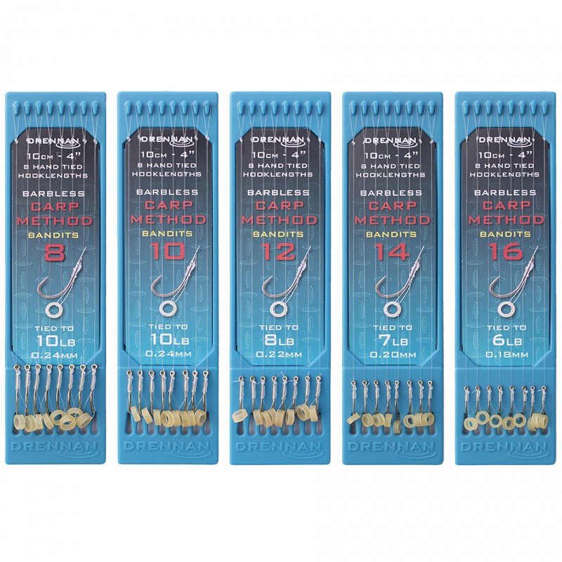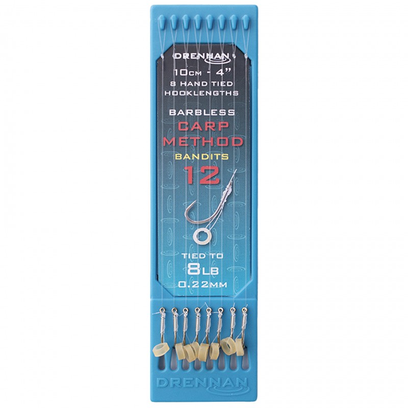 These hand tied method feeder rigs use barbless Carp Method hooks tied to 4”/10cm of XT mono. The bait bands are extremely versatile and can be stretched around or pulled inside making them a great option for a wide variety of hook baits. The 4” hook plates keep the rigs stored under slight tension, so they are perfectly straight and ready to use without any kinks. Available from Size 8 for large hook baits and big carp, down to small size 16 for a more finesse approach for smaller carp and F1’s.